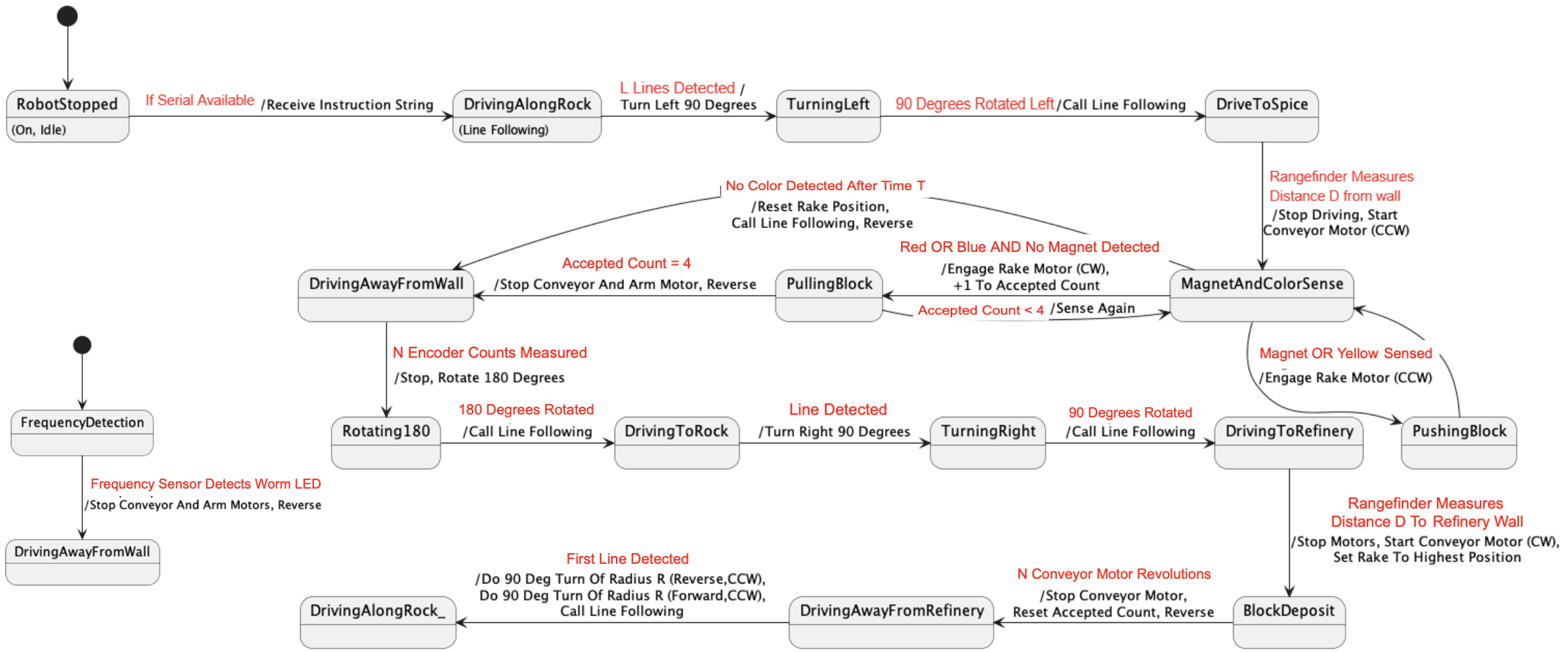 The goal was to collect as many blocks as possible and deliver them to a refinery at the team's base while avoiding simulated "sandworms," which were triggered by the robot’s movements and visualized through LED indicators. Robots had to operate autonomously after an initial wireless command.