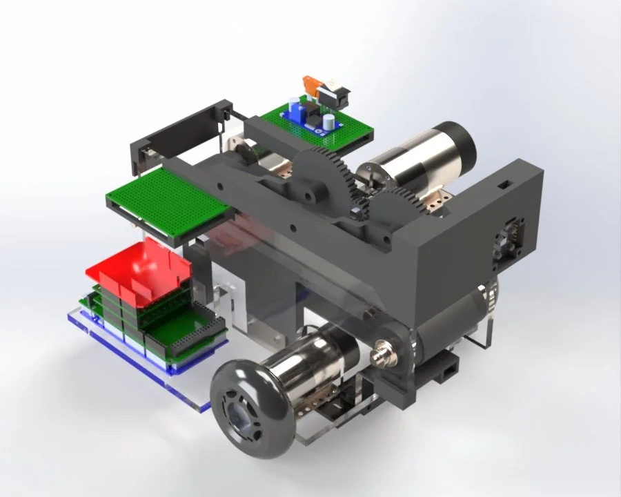 Many components of the robot, such as the board mounts, motor mounts, sensor mounts, battery mounts, pulleys for the conveyor, and the rake system, were 3D-printed. Additionally, the acrylic components were precision laser-cut to meet design specifications.