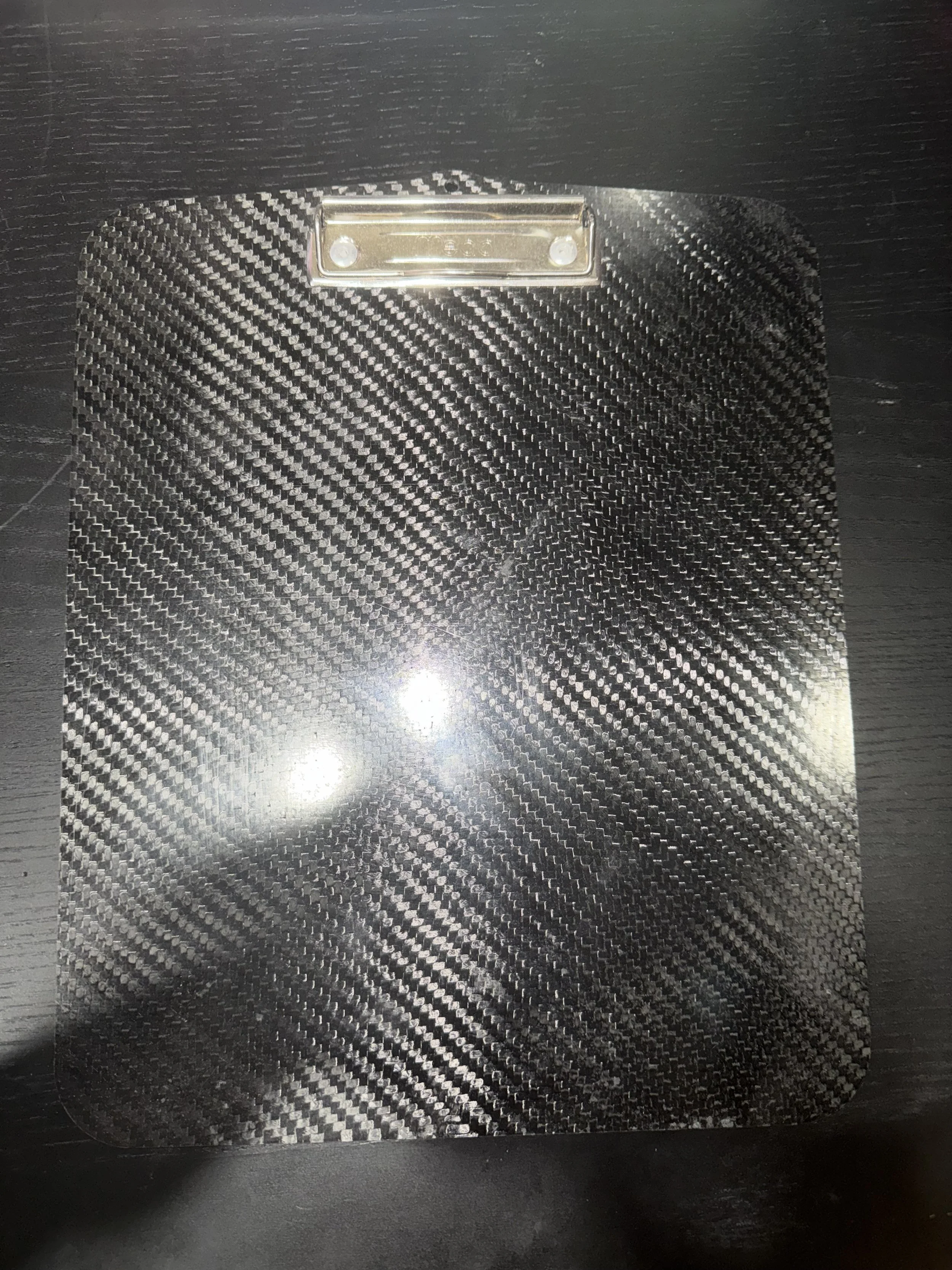 This is a clipboard I made using the wet layup method. Wet lay-up involves manually impregnating the plys with resin using a tool such as a roller or squeegee. The other type of layup is prepreg (pre-impregnated). Prepreg carbon fiber already contains resin that is partially cured. It is ready to be placed onto a mold and then fully cured in an oven.